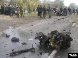 На месте взрыва легковой машины с террористом, подорвавшим себя во время проезда колонны министра МВД Ингушетии, 30 сентября 2008