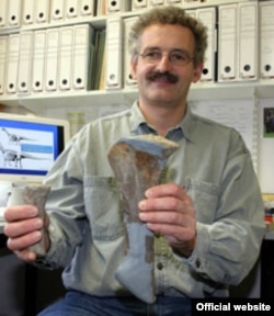 Палеонтолог Мартин Зандер с костями карликового динозавра. Новый вид динозавра назван учеными - Европазаурус Хольгери (Europasaurus holgeri) и увековечивает имя собирателя камней Хольгера Людтке, искавшего окаменевших морских ежей и нашедшего зуб динозавра. Впоследствии ученые обнаружили на том же месте кости сначала 11, а затем и еще 9 карликовых динозавров, а также один полностью сохранившийся череп.