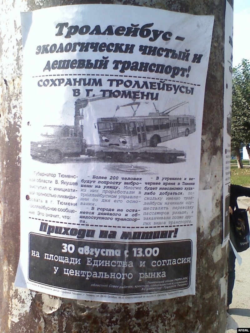 Поддержать троллейбусников собралось около ста человек. Впрочем, поскольку митинг проходил в самом оживленном месте – возле центрального рынка, многие ставили свои подписи под обращением и спешили дальше по делам. До политической подоплеки, навязываемой коммунистами, им, похоже, дела не было, а вот за "рогатый транспорт" обидно. Говорит тюменец Владимир Квашнин: