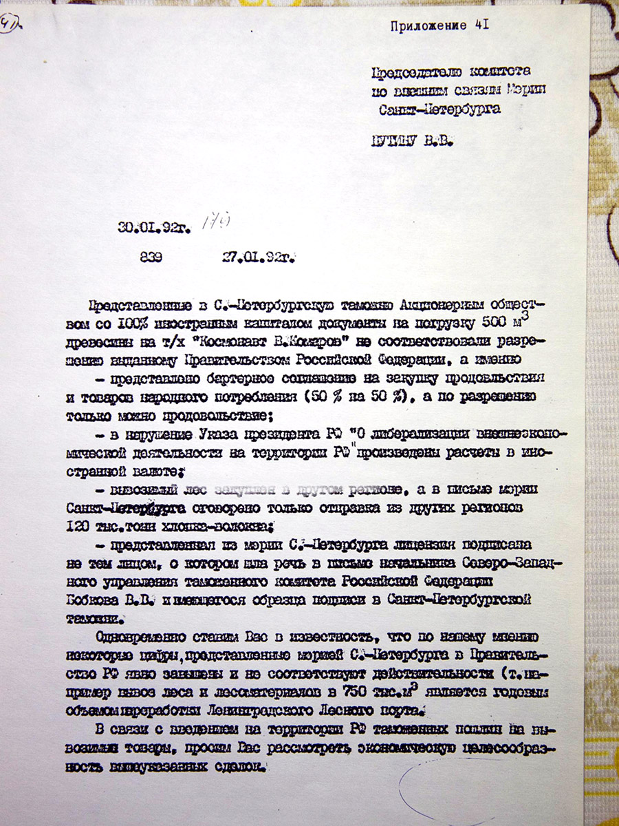 13 января 1992 года Путин получил запрос из Петросовета с требованием "представить исчерпывающую информацию и полный комплект соответствующих документов", касавшихся выдачи лицензий. Он должен был это сделать на следующий день, 14 января, на специальном закрытом заседании в Петросовете. На заседание Путин не принес ничего, кроме небольшой справки, уместившейся на двух листках бумаги.