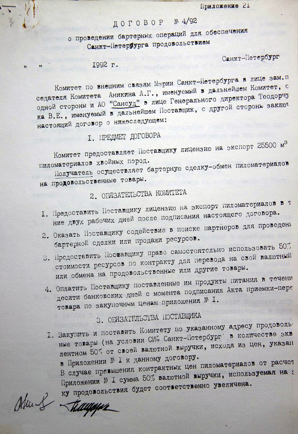 Тем не менее, лицензии подписаны почему-то именно Путиным, а также его заместителем Александром Аникиным. И они же заключали экспортно-импортные контракты от имени Комитета по внешним связям мэрии Питера. Ничто не мешало Путину