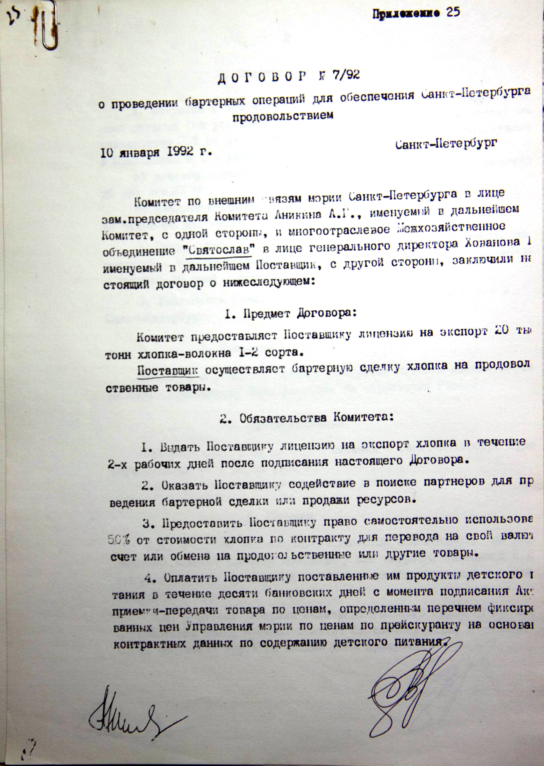 Фирма "Святослав" получила от Путина лицензию на вывоз высококачественного хлопка. Общая сумма контракта составила, как указано в приложении, 24 миллина долларов (но при этом не поясняется конечный покупатель - кому "Святослав" собирался продать хлопок за границей; поэтому эту сумму можно поставить под сомнение), но к моменту начала депутатского расследования компания "Святослав" вывезла лишь часть из 120 тысяч тонн хлопка. По адресу, который фирма указала в Москве как свой, размещался Уникомбанк. Но это только кажется странным. Членом совета директоров Уникомбанка в начале 90-х являлся Джалдасбек Айтжанов, возглавлявший "Московский концерн по производству продукции текстильной промышленности".