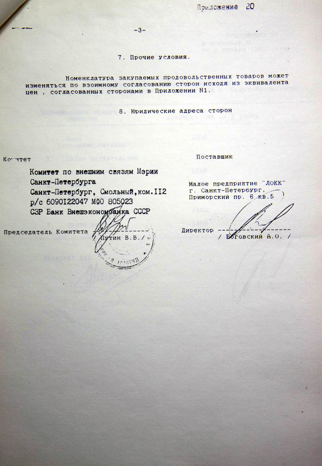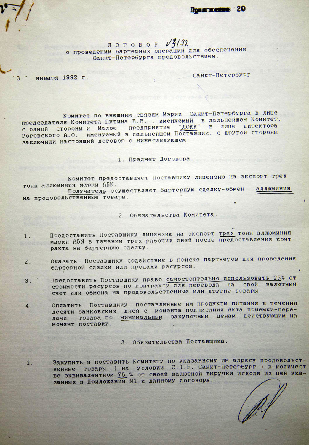 При этом российский "поставщик алюминия" даже не указал свои банковские реквизиты. Этот договор подписан лично Владимиром Путиным. Подписан 3 января. А разрешение о выделении Санкт-Петербургу квот на экспорт сырья относится к 9 января 1991 года (подробнее об этом разрешение - далее).