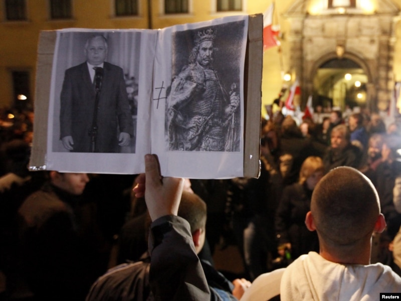 Митинг против захоронения президента Леха Качиньского с супругой в замке Вавель. Надпись на плакате: "Достоин ли он королевских похорон?"