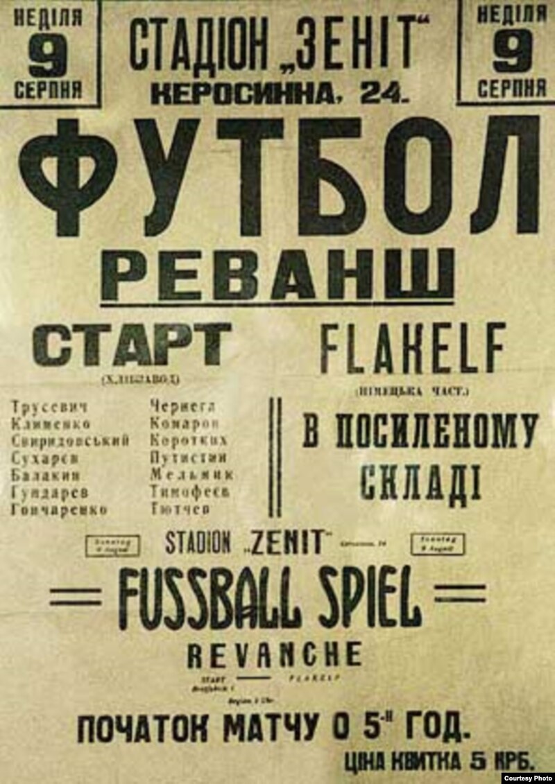 Потом было сыграно два матча со сборной немецких зенитчиков – "Flakelf". Особый интерес вызывает второй матч – 9 августа 1942 г. Первая встреча с зенитчиками, состоявшийся за три дня до этого, закончилась их разгромом – 5:1. Немцы собрали на матч-реванш усиленную команду. Киевляне снова победили – 5:3. По легенде, после этой победы киевские футболисты были расстреляны… Отсюда и название – "матч смерти" – который с легкой руки военных корреспондентов пошел гулять по страницам газет. На самом деле, через неделю, 16 августа 1942 г., состоялась игра с командой "Рух", которая и оказалась последней: счет – 8:0 в пользу "Старта". На протяжении сезона команда провела десять матчей и добилась десяти побед при соотношении забитых и пропущенных мячей – 56:11.