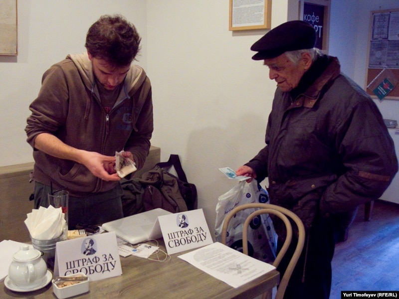 За первые два часа акции было собрано 28103 рубля. Организаторы надеются, что к вечеру народ активизируется. Борис Михайлович Болотовский (на фото) принес 300 рублей: за себя, свою супругу и друга. На вопрос корреспондента Радио Свобода о причине, побудившей его участвовать в акции, Борис Михайлович ответил, что для человека важна не только внешняя свобода, но, что гораздо важнее – свобода внутренняя.