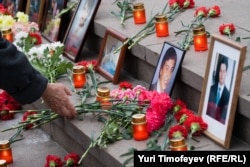 Цветы, свечи, и портреты погибших заложников на ступенях Театрального центра на Дубровке