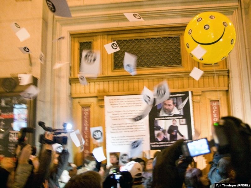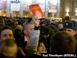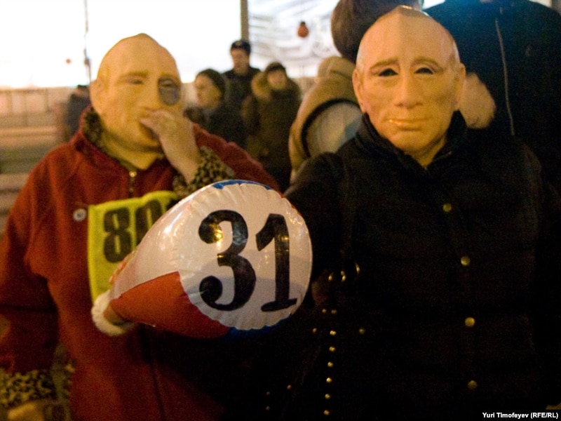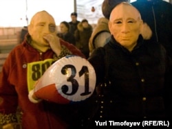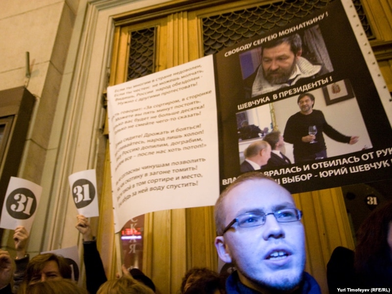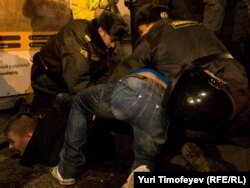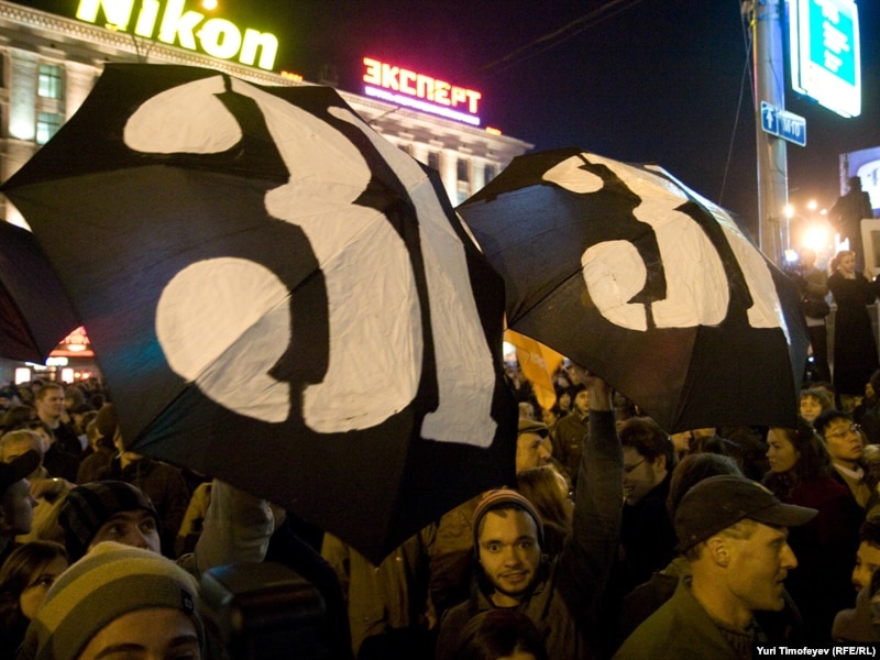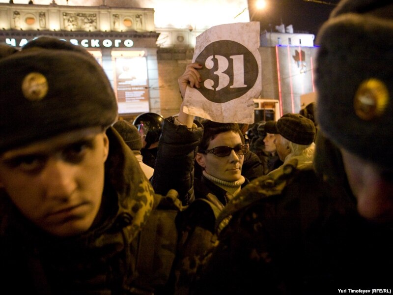 В Москве на Триумфальной площади прошла акция движения "Стратегия 31" в защиту 31-й статьи конституции, гарантирующей гражданам свободу собраний.