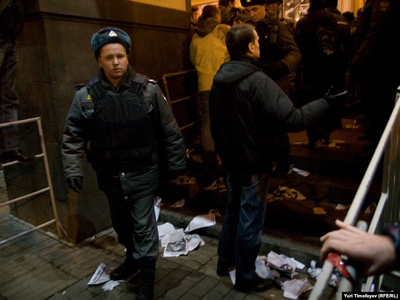 Милиция через мегафоны призывала выходящих из метро "Маяковская" людей не задерживаться и проходить на площадку у гостиницы "Пекин", где началась согласованная с властями акция, организатором которой выступила глава Московской Хельсинкской группы Людмила Алексеева.