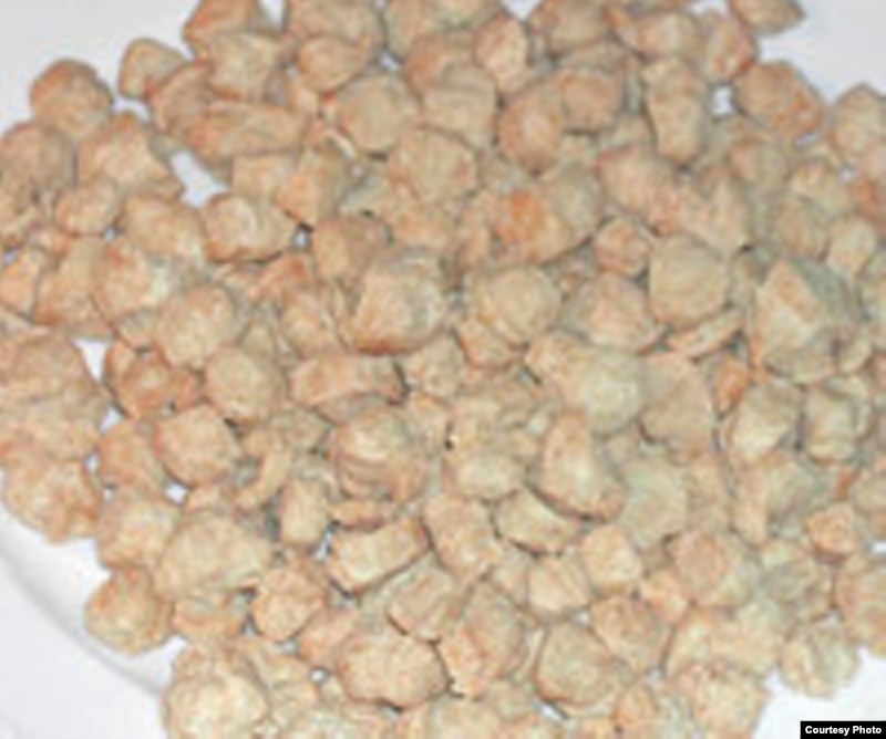 Зато русские зэки очень часто видят в своих мисках - “вискас”, “кенгурятину” и ТКСБ. Такое объедение! Действующие сейчас приказы Минюста о минимальной норме питания для осуждённых к лишению свободы, содержащихся в учреждениях ФСИН, на мирное время, таких терминов, конечно, не содержат, причём аж с 2005 года, поэтому ТТ, вероятнее всего, не мог прочитать в нормах питания и размещения, КАКАЯ это вкуснятина. А вещь действительно потрясающая: всеми этими тремя терминами описывается одна и та же субстанция – текстурированный концентрат соевого белка, по-другому известный как “соевое мясо”. Кто не видел – вот, посмотрите на картинке.