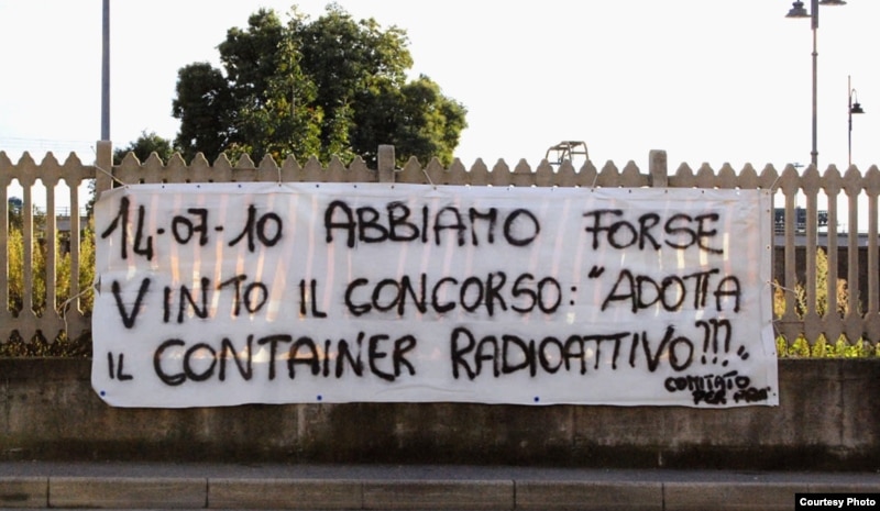 Плакат комитета местных протестующих жителей с надписью "Мы что, победители конкурса "Выиграй радиоактивный контейнер?"