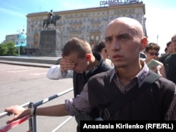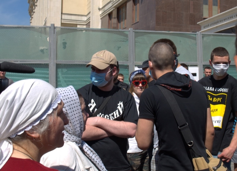 Активисты "Народного собора" советовали геям убираться вон. Хоругвеносцы плюнули в сторону геев. Полиция не реагировала.