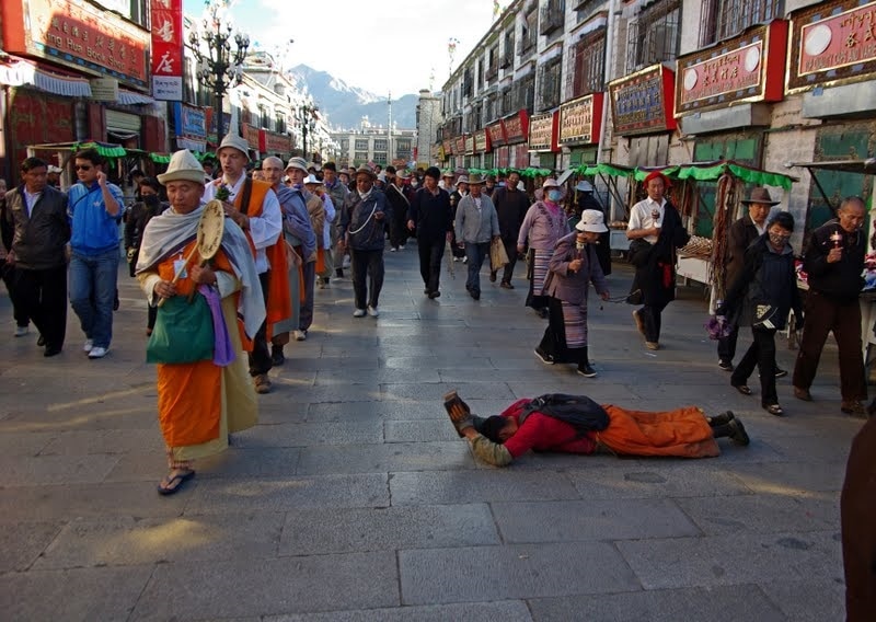 Улизнув от гида, мы по улочкам футона добрались до главного храма Тибета – Джоканг. Отсюда в VIII веке произошел Тибет как буддийское государство. Отсюда же начинались все волнения, связанные с движением за независимость в последние 60 лет. Это сердце Тибета. Вокруг него по улочкам старого города в утренние часы движется непрерывный поток верующих. Они бормочут священные слова, крутят молитвенные барабаны, некоторые – делают простирания, то есть, иначе говоря, передвигаются исключительно ползком, при этом вставая во весь рост перед каждым "переползом". Среди таких подвижников, целиком отдавших себя поклонению в самом буквальном его смысле, попадаются даже такие, у кого одна нога! И что удивительно, эту практику никак не пресекают наверняка атеистичные, идеологически выдержанные китайские полицейские. Я наблюдал картину, когда человек, передвигающийся в сторону храма посредством простираний, "переползал" улицу с оживленным движением. Светофор давно погас, но машины не трогались, пока он не оказался на другой стороне. При этом его заботливо сопровождал дорожный полицейский.