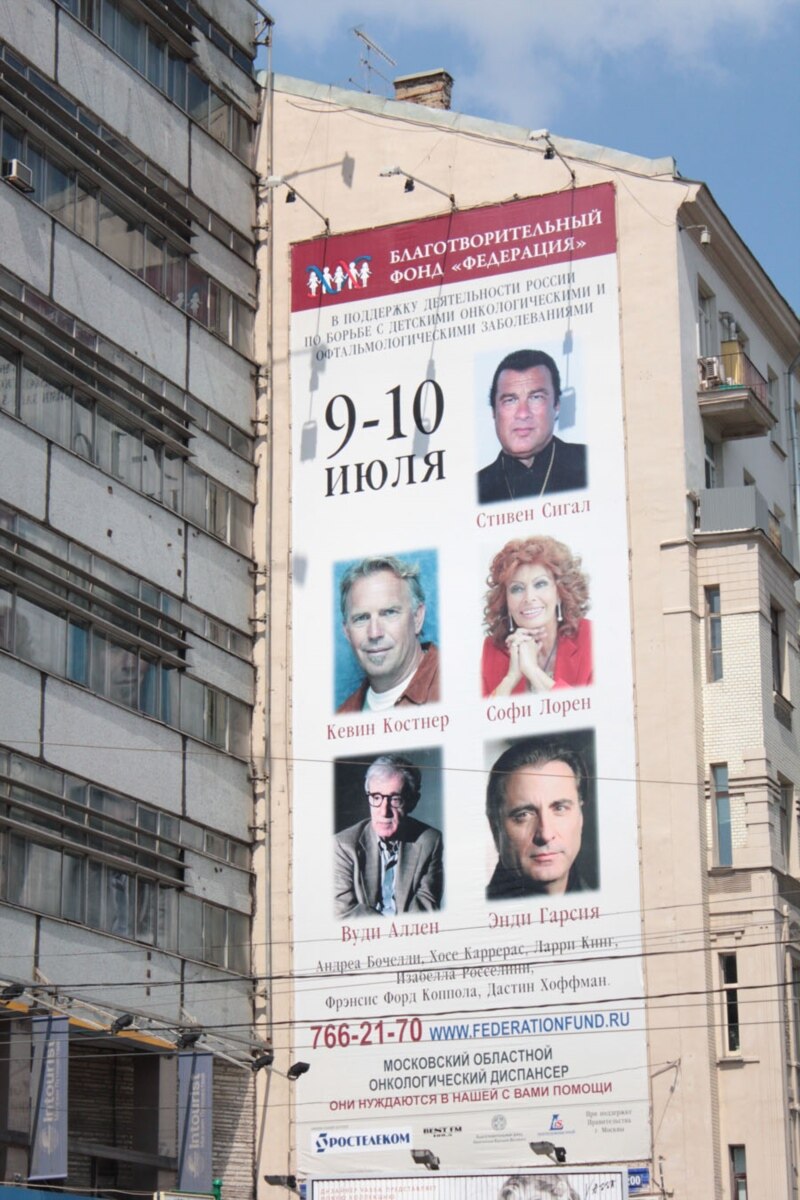 На рекламном баннере указано, что это концерты “в поддержку деятельности России по борьбе с детскими онкологическими и офтальмологическими заболеваниями”. Анонсировано участие Софи Лорен, Вуди Аллена, Ларри Кинга, Дастина Хоффмана и других звезд.