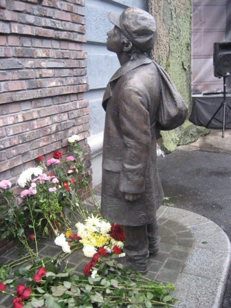 Виктор Некрасов: Думая о том, как отметить (я не знаю, как это назвать - в памяти, мемориалами, архитектурно), как отметить гибель людей, я вспоминаю два таких памятника. Один - в Сталинграде на Мамаевом кургане. Это не только гибели, а и победе памятник, памятник, мягко выражаясь, многословный, громоздкий, тяжелый, безвкусный, с обилием фигур и Матерью Родиной высотой сто с чем-то метров. И там, среди этой роскоши и безвкусицы, есть такой мемориал: зал большой (опять-таки - безвкусный) посреди него какая-то странная рука из земли вырастает и факел в ней, а на стенах – имена, имена, имена, фамилии погибших в Сталинграде. Причем, вероятно, не всех, потому что многие погибли, и никто не знал об их гибели. Но эта круглая стена с именами, когда я туда вошел… Должен сказать, что он как раз на месте тех окопов, где я воевал, на вершине Мамаева кургана. И мне казалось, что другой какой-то должен быть памятник. Но когда я вошел внутрь этого мемориала, еще звуки Грига, Шопена, все во мне повернулось, слеза, ком в горле, я даже наклонился и поцеловал камень.