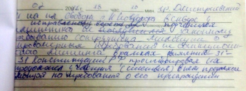 Меня судили вместе с ними. Но на мне суд споткнулся. Судья отклонял все возможные ходатайства. Но даже судья согласился, что не может понять, что же мне вменяется в вину. Я держу в руках протокол, составленный участковым оперуполномоченным Медовым Ф. М. Наверное, Федором Михайловичем. Может быть, он тоже писатель. И что же написал этот писатель? Сохряняю орфографию: я "у памитника не послушился законному требыванию (через "ы") сотрудника милиции о непровомерных требований несонкционированного митинга". Я сказал, что не понимаю, в чем меня обвиняют: составитель протокола не владеет русским языком в достаточной степени. Судья махнул рукой и сказал, что ладно, протокол необходимо направить на пересоставление, - сказал правозащитник.