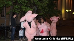 19:18 Пришли представители прокремлевских движений в костюмах свиней. Корреспондент РС опознал в присутствующих в толпе представителей прокремлевских движений, однако они пока никак себя не проявляют.
