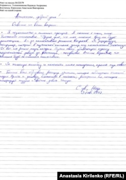 Корреспондент Радио Свобода связался с Надеждой Толоконниковой, находящейся в СИЗО-6 Москвы, через сервис отправки электронных писем ФСИН. Спустя некоторое время через этот же сервис поступил отсканированный рукописный ответ.