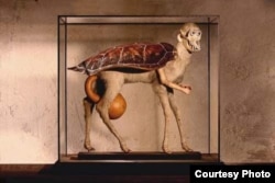 Главная мастерская Яна Шванкмайера – не на Чернинской улице, а далеко от Праги, в доме на Шумаве. Там он и мастерит своих кукол. На выставке «Возможности диалога» была одна из моих любимых – огромный, утыканный гвоздями распятый демон. У художника Шванкмайера есть великий учитель – Арчимбольдо. Первые коллажи, в которых у ящерицы вырастают крылья, позвоночник превращается в дерево, плодоносящее глазами, рыба держит ягоду в зубах, а голова человека сложена из кальмаров и улиток, Шванкмайер сделал сорок лет назад. В последних работах он возвращается к арчимбольдескам, только теперь это невозможное сочетание фрагментов флоры и фауны становится трехмерным: Я. Ш. строит композиции в аквариумах, монтируя хвосты с черепами и панцирями. Это взбесившийся Wunderkabinet – кунсткамера Рудольфа II, при дворе которого работал Арчимбольдо. Шванкмайер говорит, что в собрании Рудольфа он ценит не подлинные сокровища, а всякие нелепые предметы, сотворенные природой или рукой человека. В отличие от «высокого» искусства, они обращаются напрямую к бессознательному, их внеэстетический эффект таков же, как у магических объектов, созданных шаманами, спиритами и безумцами. У Шванкмайера огромная коллекция ар-брюта: в Чехии, особенно на юге, где силен католицизм, было много художников-безумцев. В начале века он работал над циклом автоматических, «спиритических» рисунков, и эти отчаянно яркие взрывы штрихов, похожие на увеличенные схемы строения клеток в анатомическом атласе – один из лучших разделов выставки. Шванкмайер писал, что ценит «сновидческие объекты», фетиши примитивных культур, но превыше всего ставит искусство самой природы: корни, сталактиты, бабочек, жуков, ракушки и фантастический рисунок агатов. Главный материал его последних работ – агаты, превращающиеся в совокупляющихся коротышек, зверей и ступни в башмаках.
