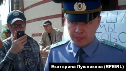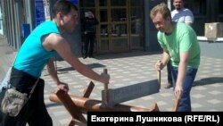 Противники Навального тоже проявили изобретательность: центром их акции стал верстак, закрепленное на котором бревно они время от времени начинали "пилить", намекая на "распил" "Кировлеса", вменяемый Навальному на суде. Был у этой акции свой лозунг: "Вор должен сидеть в тюрьме".