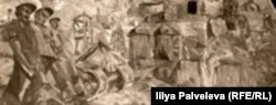 На одной стене – композиция, которой искусствоведы дали сейчас условное название «Рабочий класс». Человеческие фигуры написаны в сложном ракурсе, и это делает их динамичными. Они идут столь широким шагом, они так тесно прижимаются плечом к плечу, что становятся единым целым, под стать хорошо смазанным, отлаженным механизмам.