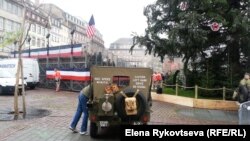А эта фотосессия показалась мне чрезвычайно занимательной. Фотограф долго снимал этих людей, а потом вдруг попросил убрать американский флажок, который всю дорогу висел над этим союзническим ретро-авто. Один из позирующих снял флажок, аккуратно сложил его в салоне автомобиля, и фотосессия продолжилась без него. Чем фотографу помешал этот флажок, я так и не поняла. А спросить было, конечно, неудобно.