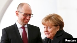 Премьер-министр Украины Арсений Яценюк и Федеральный канцлер ФРГ Ангела Меркель на совместной пресс-конференции в Берлине