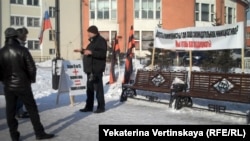 ​В тридцати метрах от митинга КПРФ "пропутинские" общественные организации развернули одиночный пикет в противовес коммунистической акции протеста. Один человек стоял в окружении флагов "Профсоюза граждан России" и "Георгиевцев". Рядом стояли баннеры с надписями: "Депутаты коммунисты, где ваша законодательная инициатива? Мы готовы вас поддержать", "Активность граждан уменьшит издержки. Создавайте ТСЖ и ТОС". Молодые коммунисты подходили к пикетчику и разъясняли свою позицию относительно "Закона о капремонте".