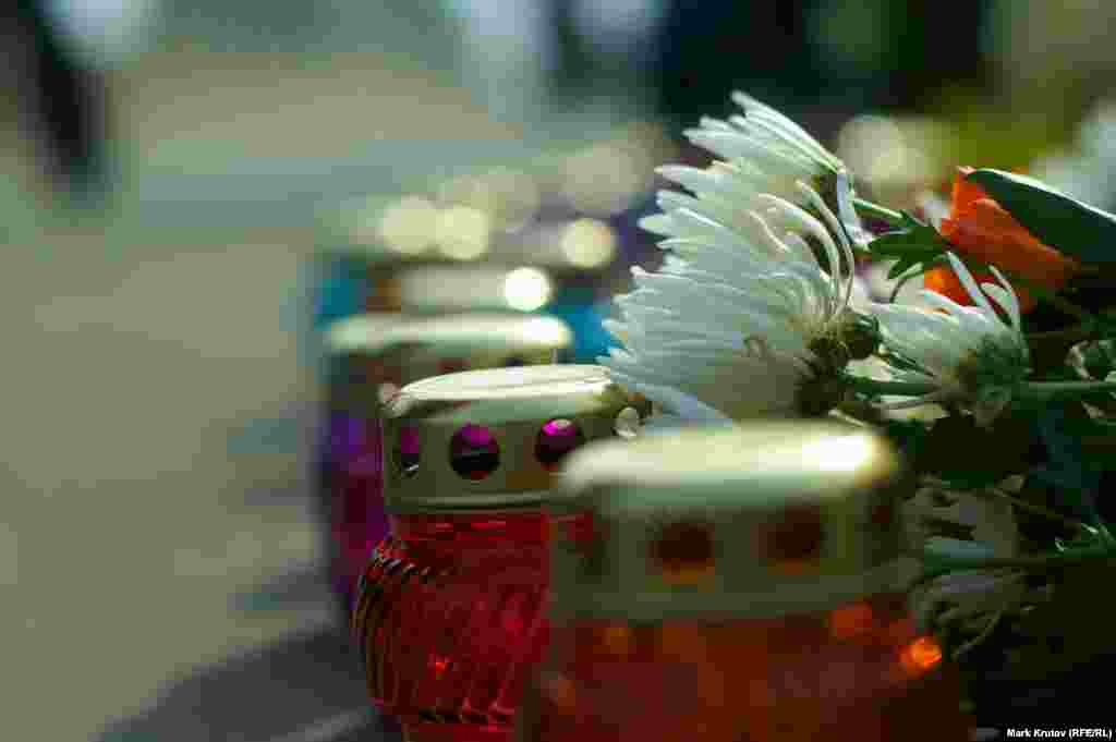 С утра около места убийства постоянно находилось несколько десятков человек, пришедших почтить память Немцова. Накануне исполнился месяц с момента совершения этого преступления
