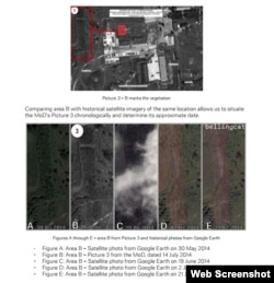В расследовании отмечается, что спутниковые фотографии, представленные Минобороны России в ходе пресс-конференции в июле прошлого года, на которых, как утверждалось, изображен украинский "Бук" 14 и 17 июля, на самом деле являются снимками от июня 2014 года. Расхождения в предоставленных Россией изображениях видны в общедоступных фото на Google Earth.