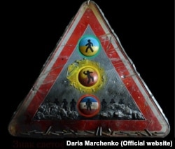 – Эта работа находится в музее Берлинской стены "Чекпойнт Чарли", Это дорожный знак, на нем человечки: красный, зеленый, желтый. На нижнем, красном стоит человечек с оружием по стойке смирно, выше него на желтом фоне человек, швыряющий коктейль "Молотова", то есть это переходное состояние, свобода или несвобода, а выше человечек идет, он в свободе. На верхнем знаке он на фоне флага Украины, на нижнем – флаг России. За человеком, стоящим с оружием, заснеженные баррикады (там я особый способ объемный сделала, работа по металлу), и за ними стоит колонна человечков с такими антеннами в головах, то есть зомбированное войско. Это выбор человека: либо в войске, либо вообще проходит мимо. Но самая главная фишка этой работы заключается в том, что сначала, учитывая то, что происходит сейчас, и учитывая флаг Украины, ты сразу воспринимаешь нижний как флаг России. Но если вы присмотритесь, вы увидите, что на фоне стоящего с автоматом человека и этого войска не флаг России, а флаг Югославии. Несмотря на эту агрессию, несмотря на этот ужас, на огромное количество пострадавших, несмотря на это все, я изобразила флаг Югославии – это попытка из последних сил не обозлиться и не указывать на агрессора, а оставить ему шанс и указать на Югославию: посмотри, что происходит с государствами, которые выбирают этот путь. У меня была выставка в Нью-Йорке, серия "Таков путь к звездам". Это вышиванки, которые пронизаны гильзами, – жизнь ребята отдают, цена нашего самоопределения. Я не знаю, какая из гильз что принесла, я знаю, что некоторые гильзы – гильзы-минус, которые забрали жизнь. Я специально не выделяю их, я стараюсь не знать, в какой из работ они присутствуют. Мне стыдно это будет сказать, но я как художник влюблена в этот материал, потому что он очень красивый, он очень благородный, этот фатум в нем присутствует. Мне никогда не нравилось золото. А вот, как я их называю, "золотые гильзы", имеют благородное что-то, они особенные. Я с гильзами работаю уже больше полугода.