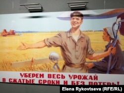 Почему, вы спросите, никакой не Путин, а именно коммунисты? Потом что на них прямо указывал второй этаж выставочного павильона. Он тоже был посвящен пшенице. Только уже в виде нарисованной на плакатах. Это были плакаты 50–70-х годов. На каждом из них был лозунг. "Уберем без потерь", "Хлеб Родине", "Больше зерна Родине", " Поля орошай – повышай урожай!", "Звенит в колосьях золотых советской молодости слава!", "Много снега – много хлеба".
