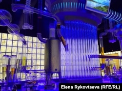 Для полноты всей картины надо сказать, что на этой выставке был еще один продукт производства Российской Федерации. В центре зала, остекленного витринами с зерном и освещенного космическим фиолетовым светом стоял загадочный стеклянный аппарат, похожий на самогонный.