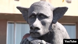 В День независимости Украины, 24 августа, перед зданием Облгосадминистрации в центре Запорожья появился удивительный памятник: похожее на черта существо с лицом Владимира Путина скорбно обнимает мертвого снегиря. К скульптуре прилагается табличка с надписью, стилизованной под старославянскую письменность: "Сей памятник воздвигнут в знак скорби "русскаго мира" о злодейски убиенных жидобандеровцами русскоязычных снегирях". Изваял памятник скульптор Александр Третьяк, а идея принадлежит запорожскому бизнесмену Максиму Дрозденко.