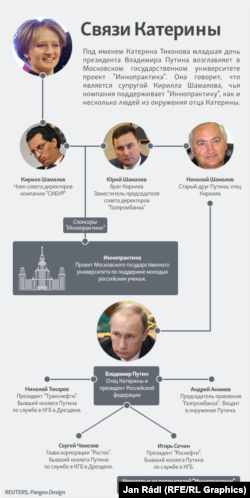 Андрей Акимов, председатель правления Газпромбанка, сообщил корреспонденту Reuters, что встречался с Катериной, которой сейчас 29 лет, еще когда она была ребенком. Видел он ее и в менее отдаленные времена. По словам Акимова, Катерина живет под фамилией Тихонова (ее идентичность уже не раз обсуждалась в СМИ и социальных сетях. – РС). Катерина называет себя супругой Кирилла Шамалова, сына Николая Шамалова, давнего друга президента Путина. Шамалов-старший – акционер банка "Россия", который американские власти считают банком российской элиты.