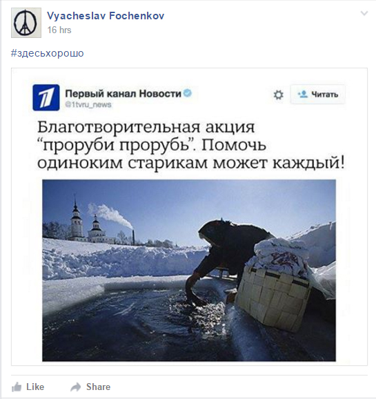 Сначала тебе полощут мозги по рос. тв. про "величие россии и Крымнаш", потом счастливо идешь полоскать белье в проруби.