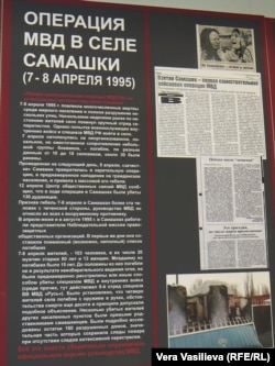 На посвященном этому событию стенде мы сделали сопоставление между тем, что говорят беженцы из села Самашки, которых опрашивали члены Правозащитного центра "Мемориал", и официальной информацией.
