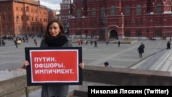 В Москве на Манежной площади активисты провели серию одиночных пикетов с требованием импичмента президента России Владимира Путина в свете публикации журналистского расследования о связанных с ним офшорных компаниях. Об этом в "Твиттере" сообщил оппозиционер Николай Ляскин.
