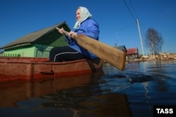 А вот эта бабушка из поселка Холуй Ивановской области точно не смотрит "Прямую линию" с президентом Путиным. Она просто плывет в лодке к своему дому, пострадавшему от паводка. 14 апреля 2016 года