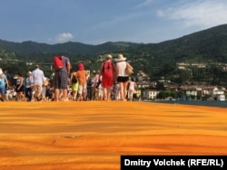 Оказавшись на вокзале в Брешии, откуда уходит поезд в Сульцано, я увидел толпу на одной из платформ и не сразу догадался, что все эти люди стремятся посмотреть на творение Христо. "Плавучий пирс" открыт всего 16 дней, вход бесплатный, и успех превзошел все ожидания: десятки тысяч паломников приезжают на Изео, чтобы пройтись по оранжевой дороге. Возможно, впервые в истории произведение современного искусства стало объектом столь массового поклонения.