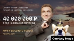 Оппозиционный политик Алексей Навальный опубликовал расследование Фонда борьбы с коррупцией (ФБК), из которого следует, что первый вице-премьер России Игорь Шувалов тратит 130 миллионов рублей в год на перелеты на частном самолете и еще 40 миллионов на перевозку собак своей жены для их участия в зарубежных выставках.