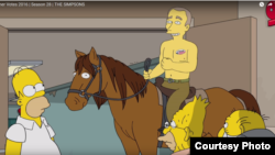 Владимир Абаринов: В новом эпизоде сериала про Симпсонов русские хакеры внесли Путина в списки американских избирателей, а Гомера Симпсона, который собирался проголосовать за Клинтон, там, наоборот, не оказалось. Из кабинки Путин выезжает верхом на коне и с обнаженным торсом и объявляет, что Трамп набрал 102 процента голосов.