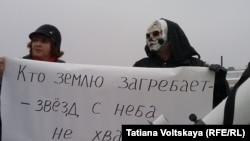 Многие участники митинга пришли с плакатами против жилого комплекса "Планетоград", который хотят построить в защитной зоне обсерватории, призывали не приносить науку в жертву бизнесу. Угрозу обсерватории символизировала фигура Смерти около телескопа.