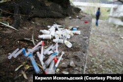 Цепочка валяющихся на дороге флаконов приводит нас на берег местного пруда. Тут этих пузырьков под ногами сотни. Шприцов обычно бывает еще больше, но не сегодня: на днях сами наркопотребители устраивали "субботник" и вынесли их на помойку в пяти пятилитровых канистрах.