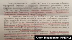 "К сожалению, вынуждены вам сообщить о том, что проведение публичного мероприятия "Митинг в поддержку требования расследовать факты коррупции высших должностных лиц России" 26 марта 2017 года с 14:00 до 17:00 на площади Нахимова и на площадке у памятника Георгия Победоносца в Парке Победы… не может быть согласовано", – говорится в ответе департамента общественных коммуникаций города Севастополя.
