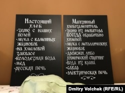 Помещение "Хлеба Соли" крошечное, продавщица в платочке похожа на пейзанку из оперетты. С ней беседует единственная покупательница, сразу объявляющая, что пришла по рекомендации невестки, чтобы посмотреть натуральные средства по уходу за кожей, но они слишком дороги. Цены здесь и в самом деле бредовые: буханка хлеба стоит 1650 рублей. Чем этот хлеб отличается от обычного, объясняет таблица. Можно также приобрести мед в пузатых банках, яйца и консервы.