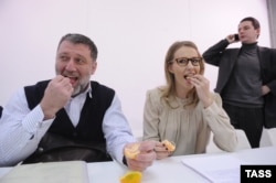 Выдвижение Ксении Собчак в президенты часто сравнивают с походом в политику бизнесмена Михаила Прохорова. Его тоже называли "спойлером" и "спарринг-партнером" Владимира Путина на выборах 2012 года. На этом фото, сделанном 15 декабря 2013 года, Собчак и Прохоров запечатлены на премьере фильма "Быстрее, чем кролики" в кинотеатре "Октябрь".