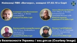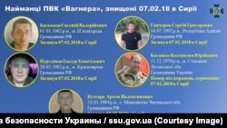Служба безопасности Украины опубликовала на днях личные данные еще девяти человек, которые, по ее данным, воевали в Сирии в составе "ЧВК Вагнера" и погибли 7 февраля в бою под городом Дейр-эз-Зор при попытке наступления на позиции "Сирийских демократических сил" и помогавших им американских военных советников (об обстоятельствах этого столкновения подробно читайте здесь). Ранее, 26 июля, СБУ на специальном брифинге обнародовала данные о 41 погибшем в этом столкновении. Всего же, как утверждают представители украинской спецслужбы, в тот день под Дейр-эз-Зором погибли более 80 наемников из России и других стран.