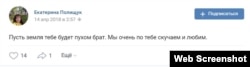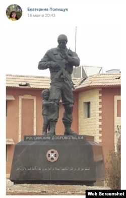 Вслед за этим на страничке сестры появляется фотография брата в парадной форме, песня певца Виктора Петлюры "Груз 200", песня группы "ЧВК Вагнер" "Жить", видеоролик "Нашим героям – ЧВК Вагнера – которые защищают мир от террористов в Сирии" и фотография памятника "Российским добровольцам", установленного в Сирии недалеко от Пальмиры. На этом монументе (его точная копия есть в Луганске, где "ЧВК Вагнера" активно действовала во время горячей фазы российско-украинской войны) изображен "вагнеровский крест" – награда, которую посмертно дают ликвидированным в бою наемникам группы Вагнера, а также надпись на арабском: "Российским добровольцам, геройски погибшим при освобождении сирийских нефтяных месторождений от ИГИЛ". Впрочем, на страничках самого Сергея Семушина ни одной фотографии из Сирии Радио Свобода найти не удалось.