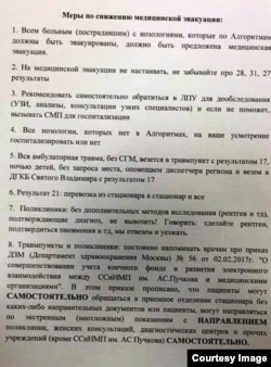 Одна из подстанций согласилась предоставить редакции фото списка таких “мер”. Первый пункт гласит, что если есть все показания к госпитализации, то пациента нужно госпитализировать. Но уже во втором пункте сказано: “На медицинской эвакуации не настаивать”.